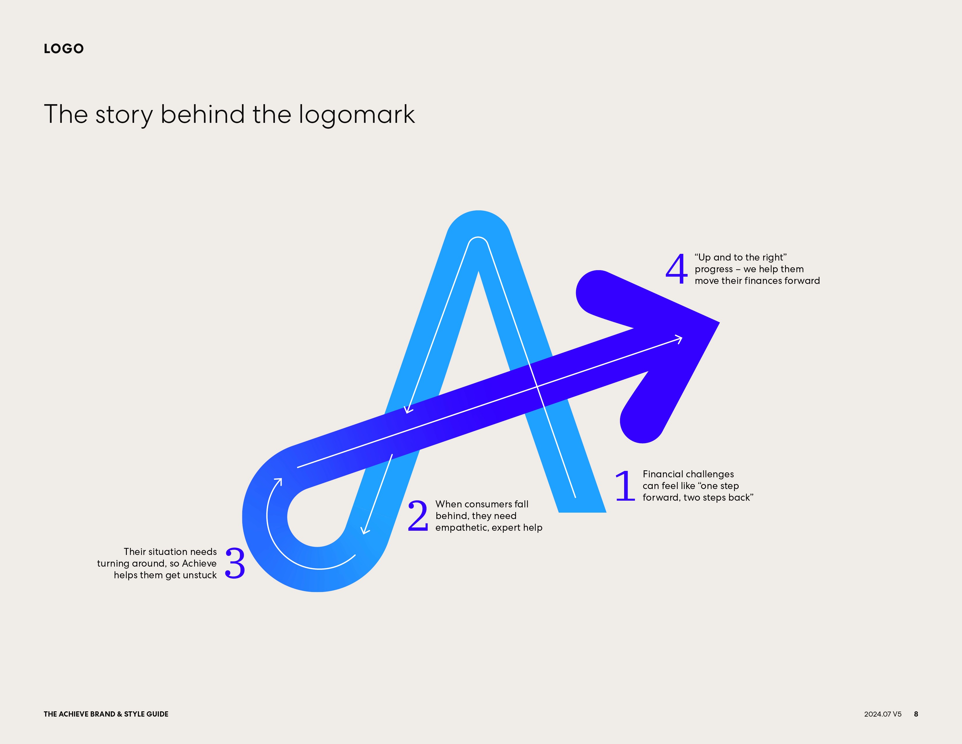 Logomark narrative: “Up and to the right” progress, reinforcing forward financial momentum.