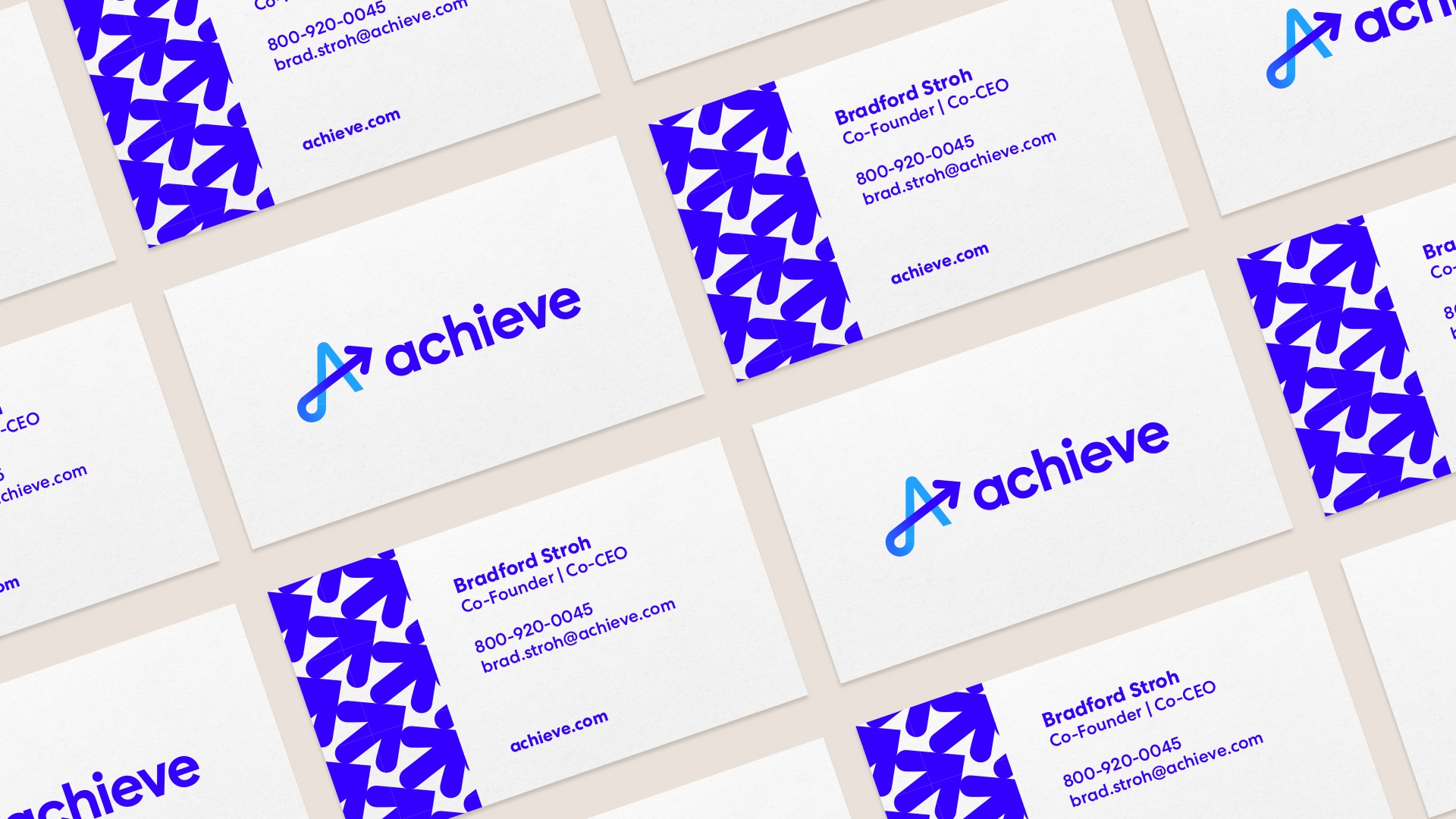 Cohesive rollout of the Achieve rebrand across major touchpoints, replacing fragmented legacy branding.