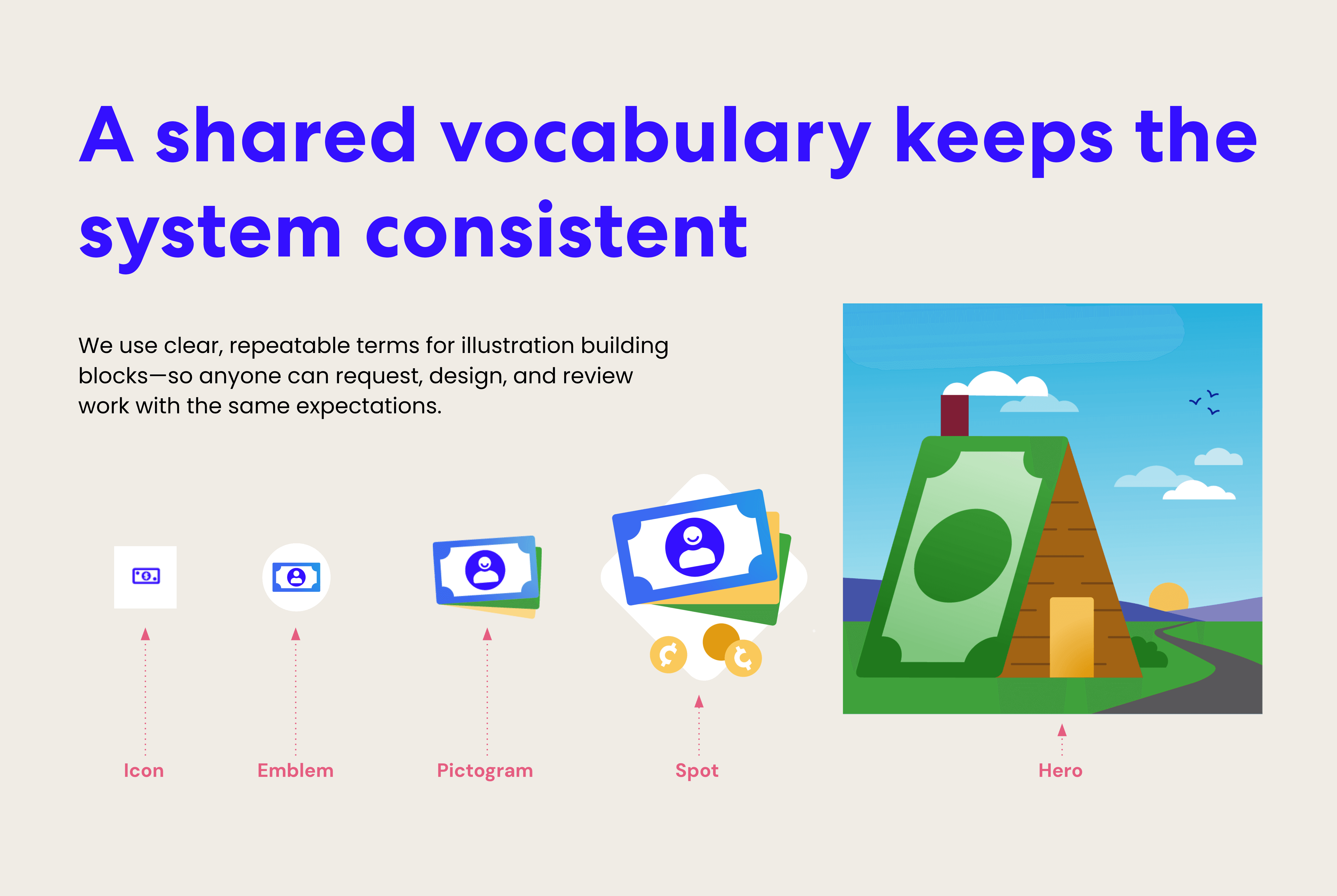 Shared taxonomy (Icon → Emblem → Pictogram → Spot → Hero)