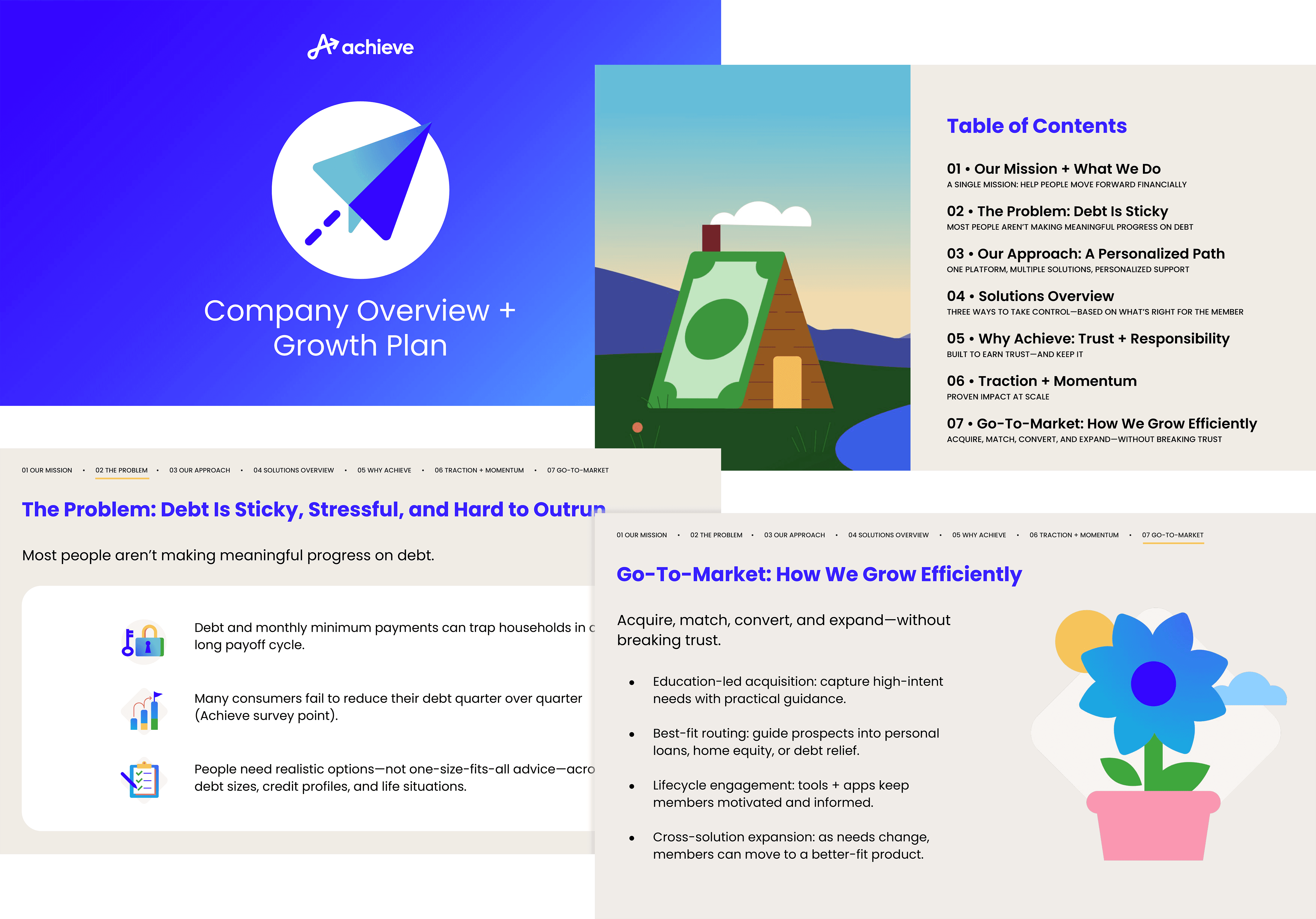 Presentations were a critical place to make the Achieve story feel human and consistent—often the first time someone encountered the brand in a longer-form narrative. I worked with Marketing and Product partners to ensure the illustration system could scale beyond campaigns and live comfortably inside decks, where pacing, clarity, and repeatability matter. We defined when illustration should lead (concept slides, section openers, emotional moments) versus when it should support information (product explainers, process flows, proof points), then documented practical rules for composition, color usage, and pairing illustration with typography.