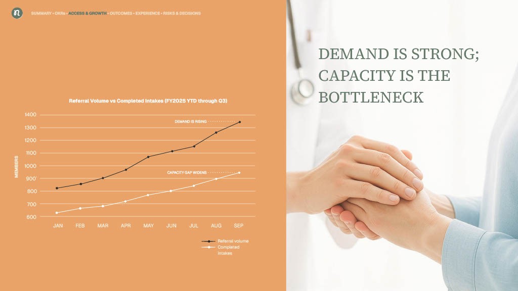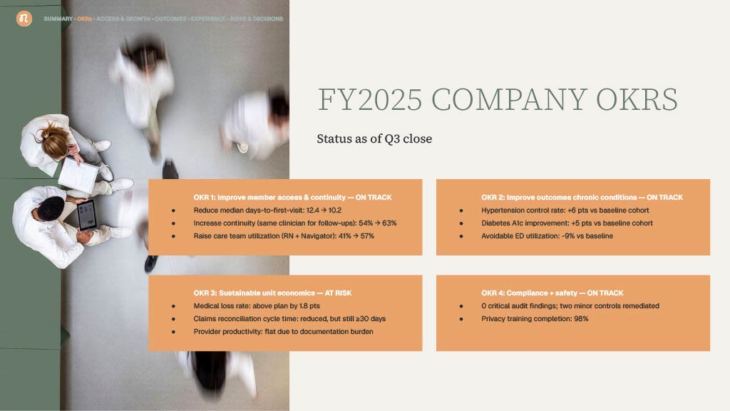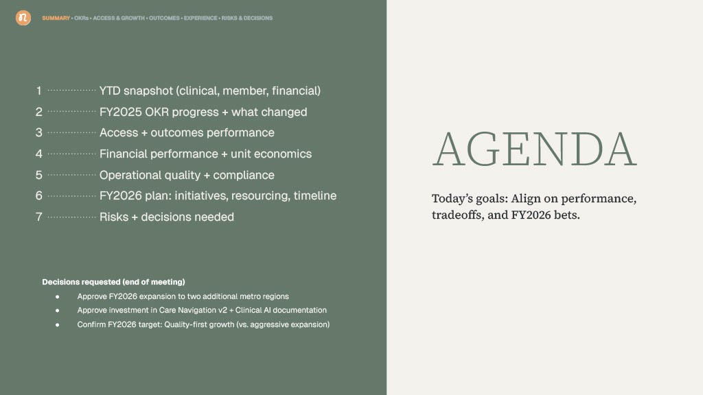 Headlines do real work. Supporting content is intentionally restrained. The result: slides that can be skimmed, presented, or shared async without losing meaning.